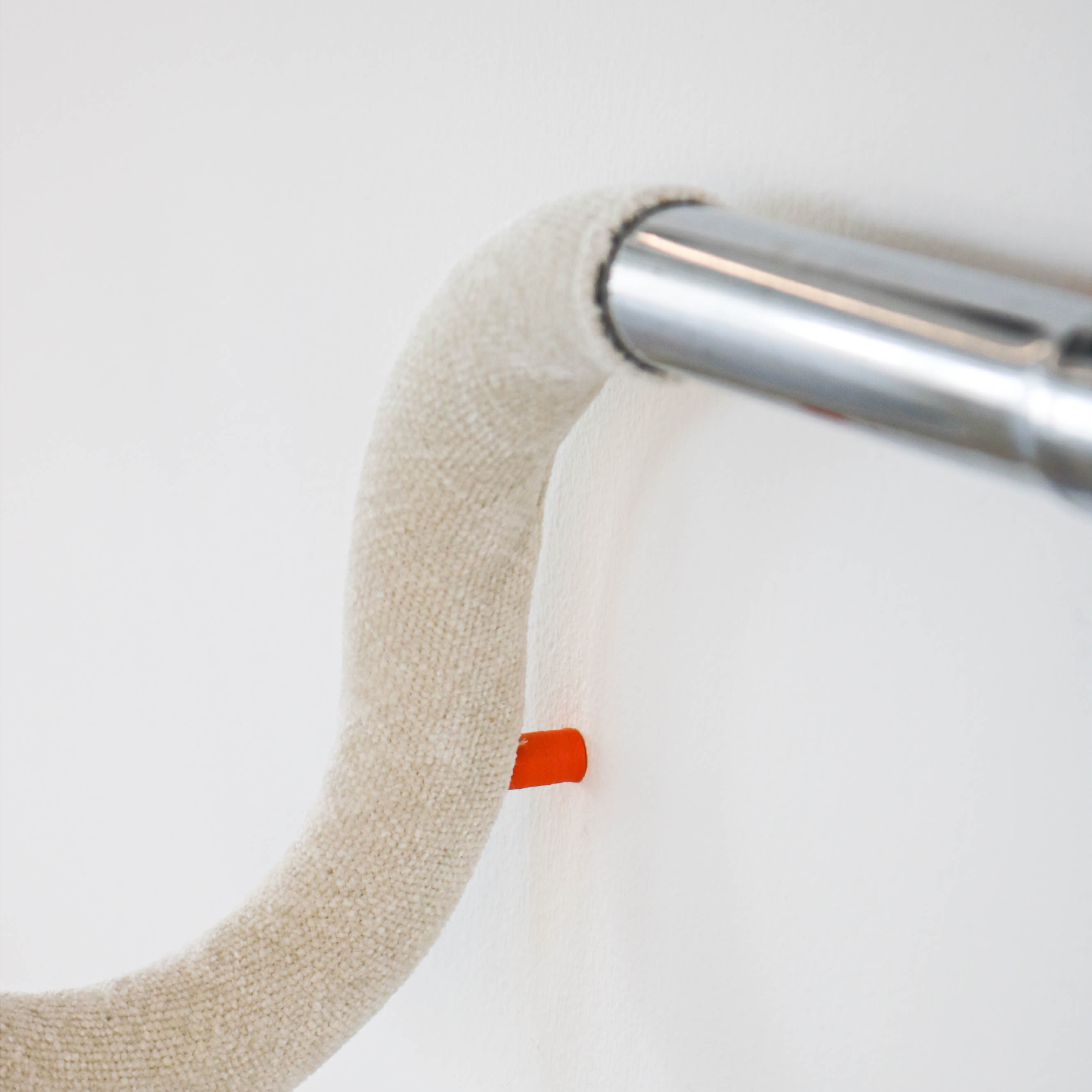 Ici, le velours habille le guidon et le transporte ainsi dans un univers domestique tout en laissant visible son métal d’origine.